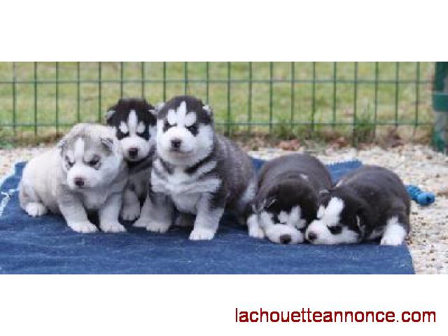 Portée de 5 chiots Husky Sibérien 1 male te 2 femelles, inscrits au LOF/ LOF-54805016-2016-1 Bons gabarits Disponibles :1 mâle,2 femelles Les parents ont un bon pédigrée et sont bien entretenus.Les chiots sont disponibles à (8 semaines), ils sont pucés, vermifugés et le 1er vaccin sera effectué et le certificat vétérinaire sera fourni .Ce sont des chiens demandant beaucoup d’attention et d’affection, ayant beaucoup d’énergie et très sportifs. Mère:250269801685434 Nous nous réservons le droit de refuser de vendre nos chiots.